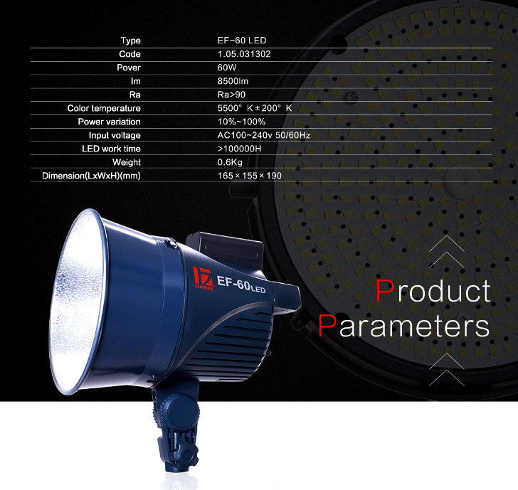EF-60W LED Light ให้ความสว่าง 8500 ลูเมน ในอุณหภูมิแสงที่เหมาะสมสำหรับงานถ่ายวีดีโอ สว่างเทียบเท่าหลอดฮาโลเจน 600W